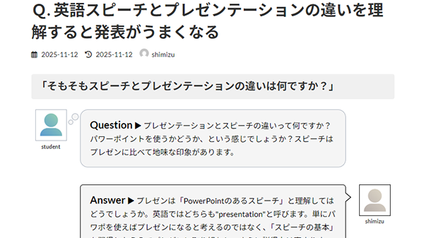 言葉遊びではありませんが、スピーチもプレゼンも、どちらも英語では"presentation"。英語でいうプレゼンテーションという言葉は、人前で自分の考えを発表する行為という意味を持ちます。