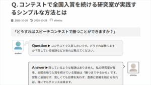 学内大会の審査基準で、(学外大会並みに)「内容」に60%以上を配当することを否定はしません。内容重視の学内大会を実施する意義は、生徒の将来の活躍を「今から」支援できる点にあります。